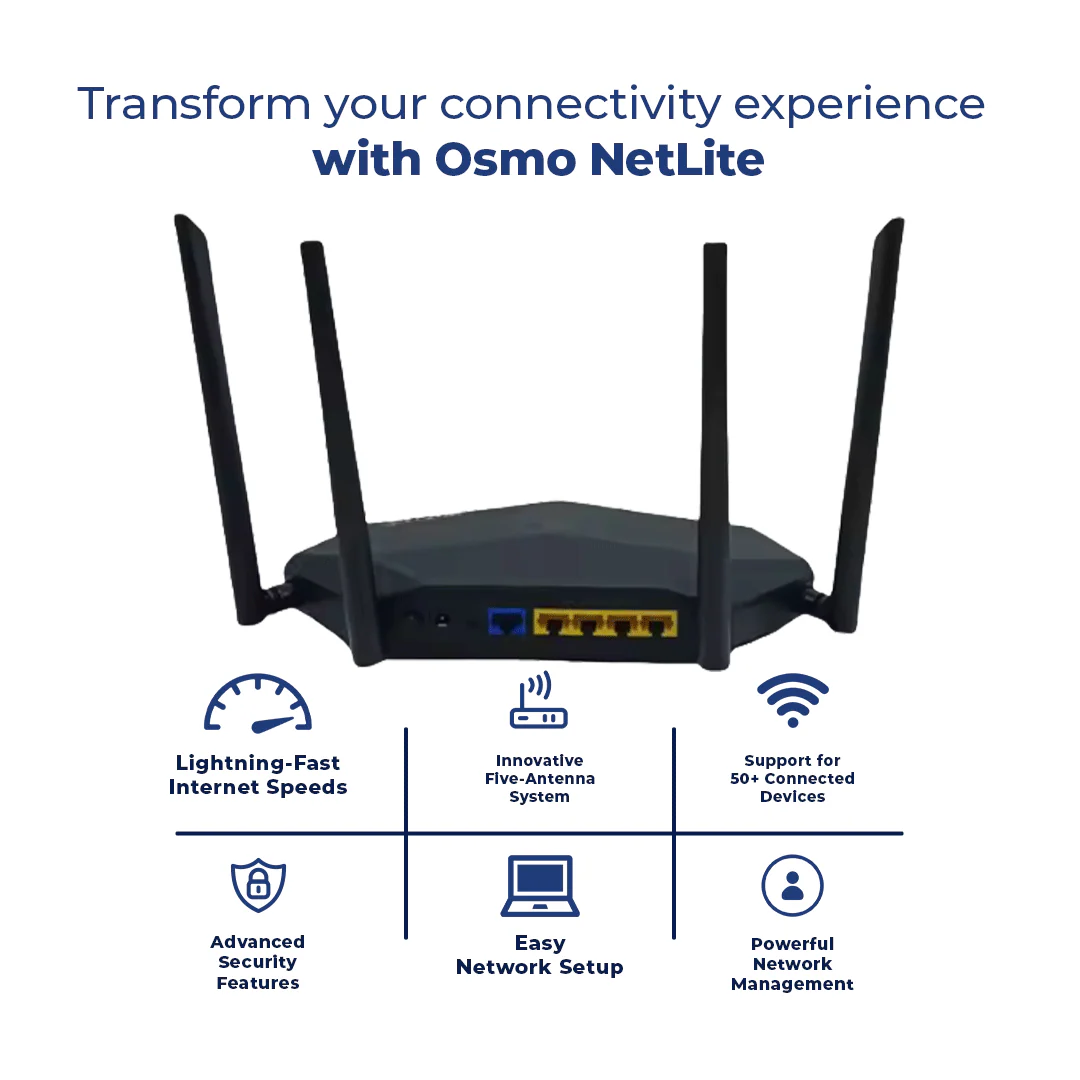 Ervaar de volgende generatie internetconnectiviteit met de Osmo NetLite VRX, de draadloze router die snelheid, stabiliteit en veiligheid combineert om aan al uw connectiviteitsbehoeften te voldoen.